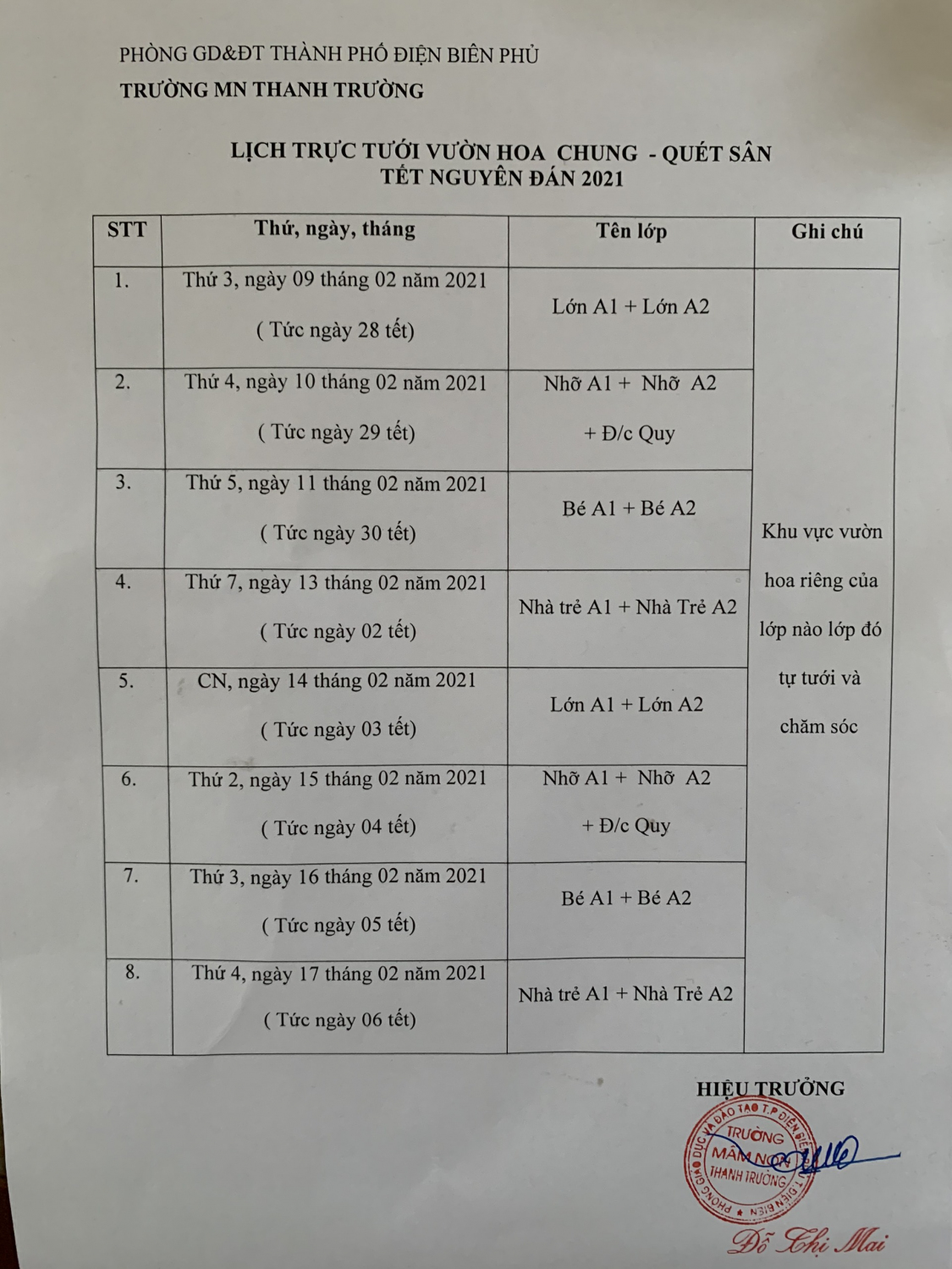 LỊCH QUÉT SÂN + TƯỚI HOA NGÀY NGHỈ TẾT 2021