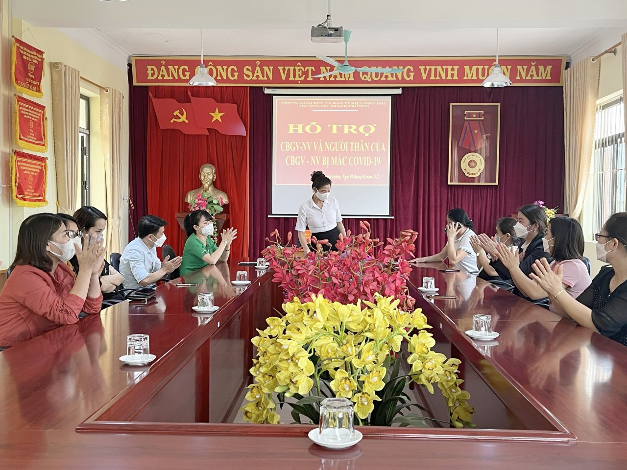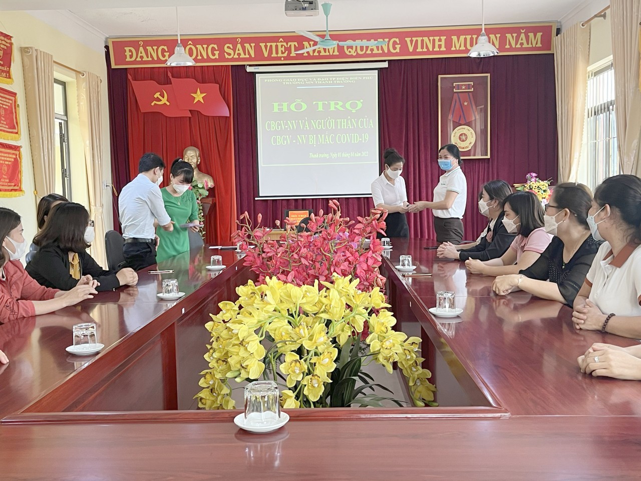 Trước diễn biến phức tạp của dịch bệnh Covid - 19 Công đoàn phối hợp với Chính quyền đã xác định nhiệm vụ phòng, chống dịch Covid-19 là trọng tâm, cấp bách và thường xuyên. Làm tốt công tác tuyên truyền đến cán bộ giáo viên, nhân viên yên tâm công tác, không quá hoang mang, lo sợ, mất bình tĩnh trước diễn biến của dịch. Cần hạn chế tới mức cao nhất việc tham gia các sự kiện và hoạt động cộng đồng; thực hiện nghiêm quy định 5K, nhất là việc bắt buộc đeo khẩu trang khi ra khỏi nhà và yêu cầu khai báo y tế. Hiện này nhà trường có nhiều cán bộ giáo viên, nhân viên và người thân trong gia đình bị mắc Covid - 19 để động viên tinh thần cho chị em. Chiều ngày 01 tháng 04 năm 2022 tại văn phòng Trường mầm non Thanh  Trường có đồng chí Đỗ Thị Mai - Bí thư chi bộ - Hiệu trưởng nhà trường; đồng chí Đặng Thị Hải Yến - Phó hiệu trưởng nhà trường - Chủ tịch công đoàn; đồng chí Phạm Thị Hiền - Phó bí thư chi bộ - Phó hiệu trưởng nhà trường đã trao quà hỗ trợ cho CBGV-NV và người thân bị mắc Covid-19. Với tổng số tiền hỗ trợ là: 11.950.000 đồng. Đây là việc làm thiết thực có ý nghĩa rất lớn thể hiện sự đồng hành, chia sẻ của tổ chức công đoàn, sự chăm lo cho công đoàn viên.