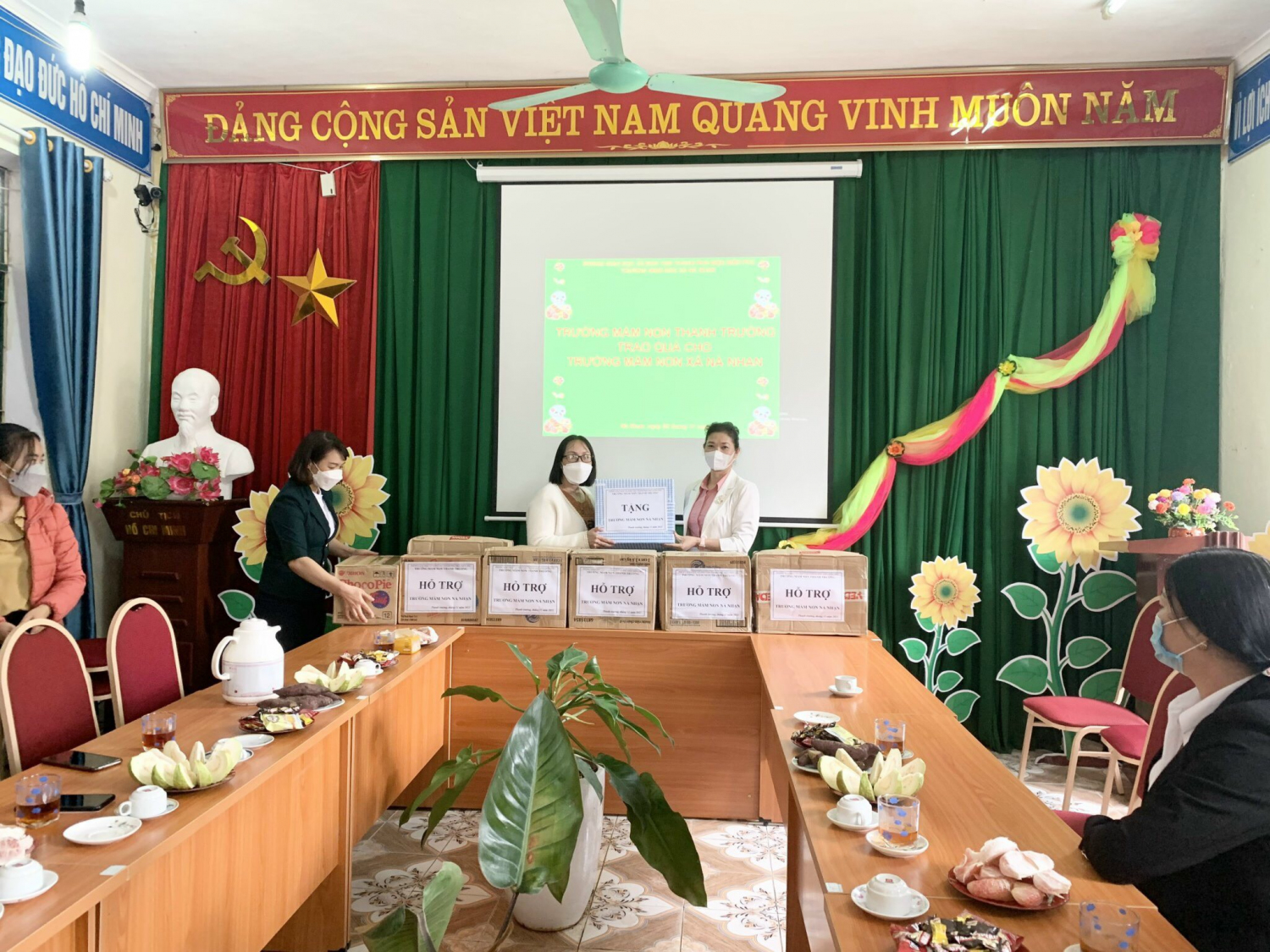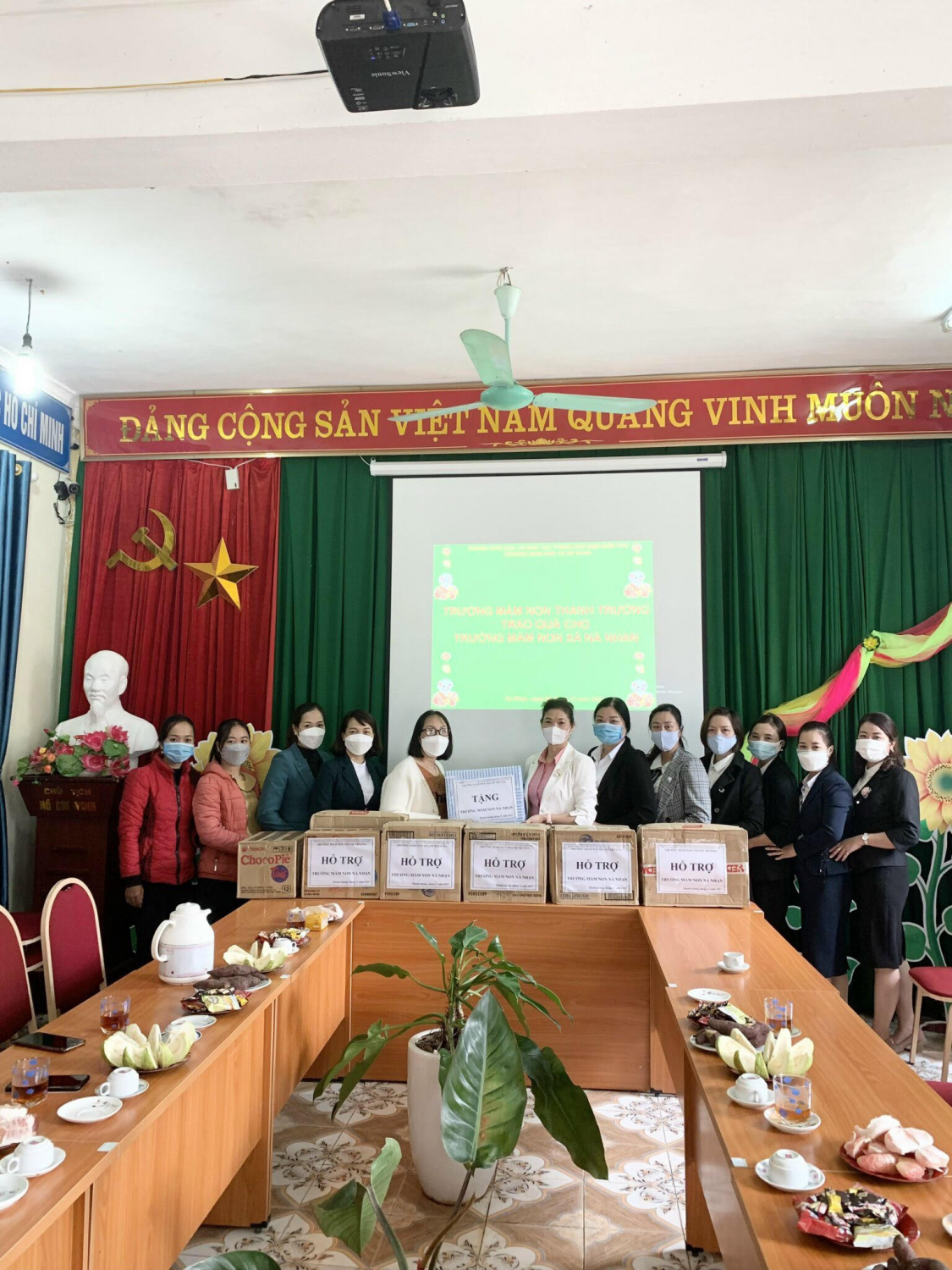 Sáng ngày 9/11/2021 trường mầm non Thanh Trường do đồng chí Đỗ Thị Mai - Bí thư chi bộ - Hiệu trưởng nhà trường làm trưởng đoàn; đồng chí Phạm Thị Hiền - Phó Bí thư chi bộ - Phó Hiệu trưởng nhà trường cùng một số đồng chí giáo viên đã tổ chức gặp mặt, chia sẻ những khó khăn cả về vật chất và tinh thần cho cô và trò trường mầm non Nà Nhạn nhằm động viên nhà trường và đã trực tiếp trao tặng: 100 gói súp Hải Châu, 24 chai nước mắm Nam Ngư, 30 kg đường trắng, 23 gói mì chính Veđan, 20 kg muối, 12 chai dầu ăn, bánh kẹo với tổng trị giá 4 triệu đồng. Món quà tuy nhỏ nhưng chứa đựng tình cảm to lớn của CBGV, NV trường mầm non Thanh Trường đối với cô và trò trường mầm non Nà Nhạn.