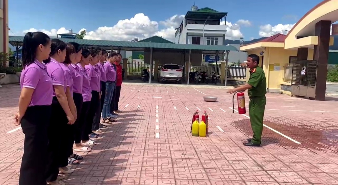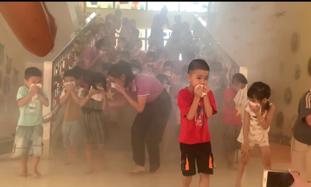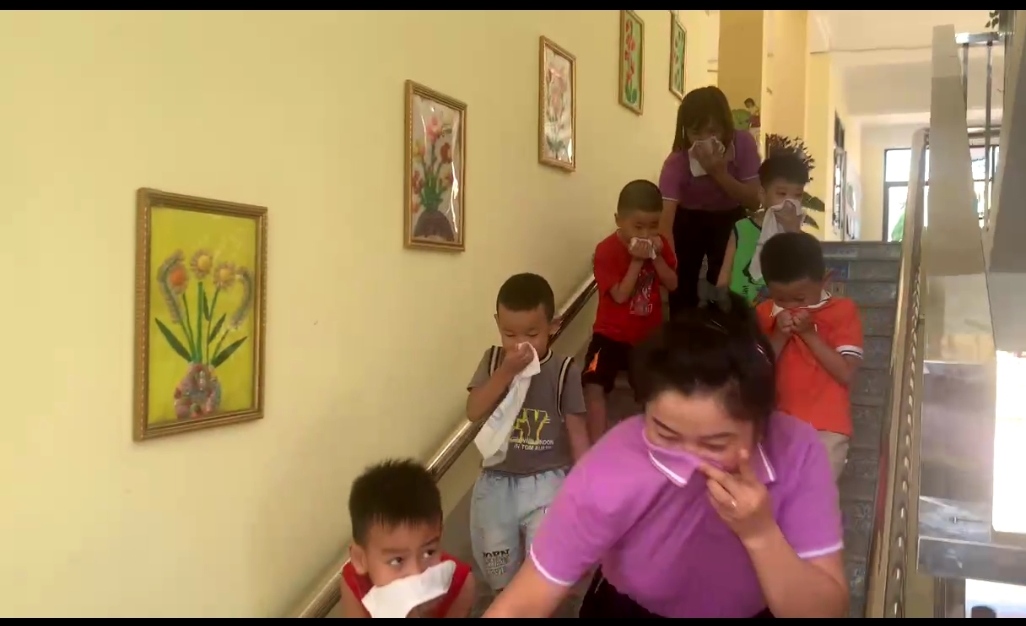 Nhà trường vinh dự được đón tiếp đồng chí Thiếu tá Lê Văn Muôn - Phó đội trưởng đội PCCC&CNCH công an Tỉnh Điện Biên, đã truyền đạt những kiến thức về PCCC, cách sử dụng đồ dùng PCCC&CNCH, thực hành các phương án PCCC & CNCH. Với tình huống giả định đám cháy được phát hiện tại lớp, các cô giáo đã hô hoán có cháy và báo tin cho các lớp xung quanh. Đồng thời đồng chí bảo vệ đã kích hoạt hệ thống PCCC tại tầng một. Giáo viên các lớp hướng dẫn đưa các con ra khỏi lớp nhanh nhất có thể, các cô luôn động viên các con bình tĩnh, lấy khăn ẩm, lấy áo che mũi, che miệng đồng thời cúi thấp người, bám men theo tường…để tránh hít phải khí độc và tập kết về điểm an toàn dưới sân trường. Trước những tình huống giả định cháy các cô và các con vô cùng khẩn trương và đã rất nhanh nhẹn lấy khăn ẩm, lấy áo che mũi miệng, cúi thấp người, bám men theo tường và di chuyển theo các cô. Tuy vậy với những tình huống cháy như vậy các con cũng rất bình tĩnh, tự tin và  không hề hoảng loạn hay xô đẩy nhau... Đây là một trong những tình huống cần có khi xảy ra các sự cố bất ngờ.
